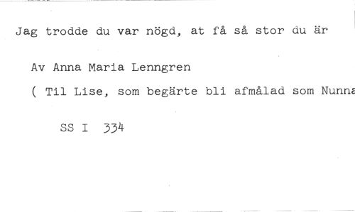Jag trodde du var nögd, at få så stor du är //// Av Anna Maria Lenngren //// ( Til Lise, som begärte bli afmålad som Nunn //// SS I 334