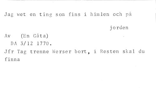Jag wet en ting som fins i himlen och på //// jorden //// Av (En Gåta) //// DA 3/12 1770. //// Jfr Tag trenne Werser bort, i Resten skal du finna