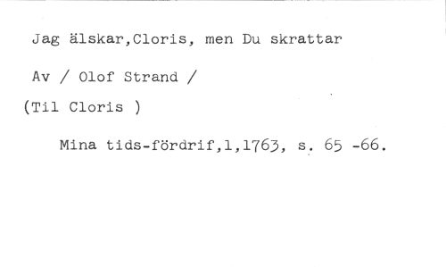 Jag älskar,Cloris, men Du skrattar //// Av / Olof Strand / (Til Cloris ) //// Mina tids-fördrif,1,1763, s. 65 -66.