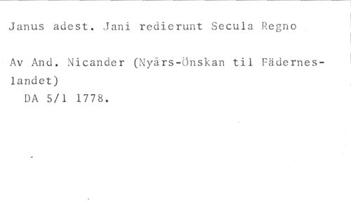 Janus adest. Jani redierunt Secula Regno //// Av And. Nicander (Nyårs-Önskan til Fäderneslandet) //// DA 5/1 1778.