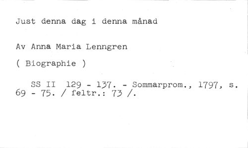 Just denna dag i denna månad //// Av Anna Maria Lenngren ( Biographie ) //// SS II 129 - 137. - Sommarprom., 1797, s. 69 - 75. / feltr.: 73 /.