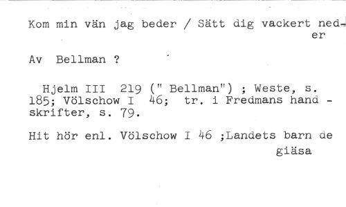 Kom min vän jag beder / Sätt dig vackert ned- //// er //// Av Bellman ? //// Hjelm III 219 (" Bellman") ; Weste, s. 185; Völschow I 46; tr. i Fredmans hand - skrifter, s. 79. //// Hit hör enl. Völschow I 46 ;Landets barn ae //// giäsa