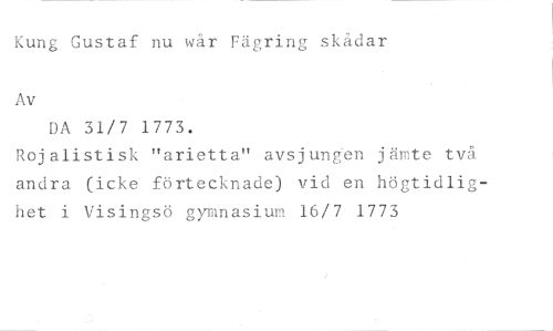 Kung Gustaf nu wår Fägring skådar //// Av //// DA 31/7 1773. //// Rojalistisk "arietta" avsjungen jämte två andra (icke förtecknade) vid en högtidlighet i Visingsö gymnasium 16/7 1773
