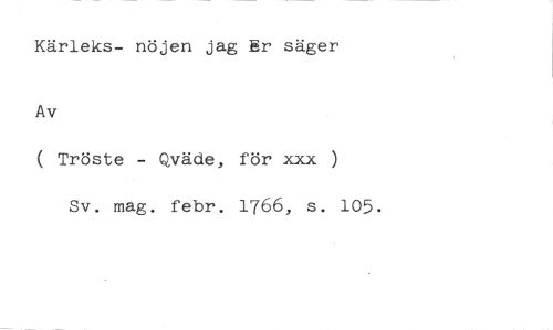 Kärleks- nöjen jag Er säger //// Av //// ( Tröste - Qväde, för xxx ) //// Sv. mag, febr. 1766, s. 105.