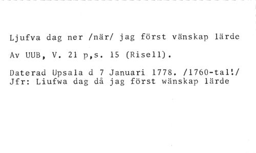 Ljufva dag ner /när/ jag först vänskap lärde Av UUB, V. 21 p,s. 15 (Risell). //// Daterad Upsala d 7 Januari 1778. /1760-talt/ Jfr: Liufwa dag då jag först wänskap lärde