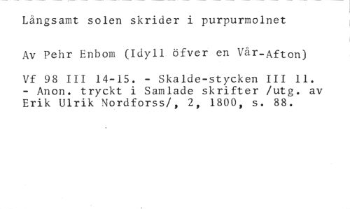 Långsamt solen skrider i purpurmolnet //// Av Pehr Enbom (Idyll öfver en Vår-Afton) //// Vf 98 III 14-15. - Skalde-stycken III 11. - Anon. tryckt i Samlade skrifter /utg. av Erik Ulrik Nordforss/, 2, 1800, s. 88.