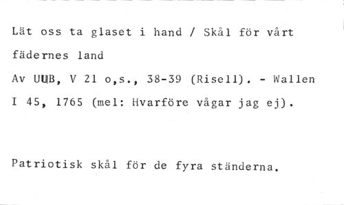 Lät oss ta glaset i hand / Skål för vårt fädernes land //// Av UUB, V 21 o,s., 38-39 (Risell). - Wallen I 45, 1765 (mel: Hvarföre vågar jag ej). //// Patriotisk skål för de fyra ständerna.