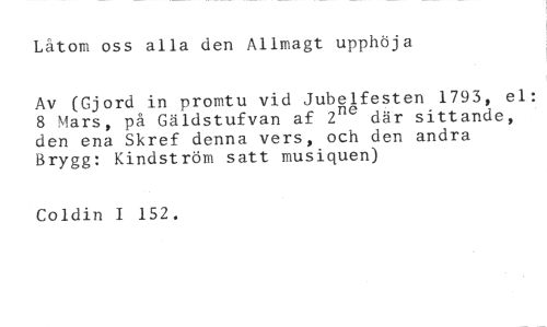 Låtom oss alla den Allmagt upphöja //// Av (Gjord in promtu vid Jubelfesten 1793, el: 8 Mars, på Gäldstufvan af 2ne där sittande, den ena Skref denna vers, och den andra Brygg: Kindström satt musiquen) //// Coldin I 152.