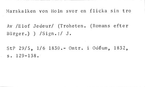 Marskalken von Holm svor en flicka sin tro //// Av /Elof Jedeur/ (Troheten. (Romans efter Biirger.) ) /Sign.:/ J. //// StP 29/5, 1/6 1830.- Omtr. i Od6um, 1832, s. 129-138.