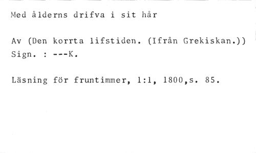 Med ålderns drifva i sit hår //// Av (Den korrta lifstiden. (Ifrån Grekiskan.)) Sign. : ---K. //// Läsning för fruntimmer, 1:1, 1800,s. 85.