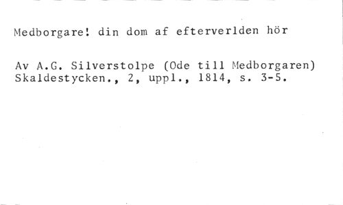 Medborgare! din dom af efterverlden hör //// Av A.G. Silverstolpe (Ode till Medborgaren) Skaldestycken., 2, uppl., 1814, s. 3-5.