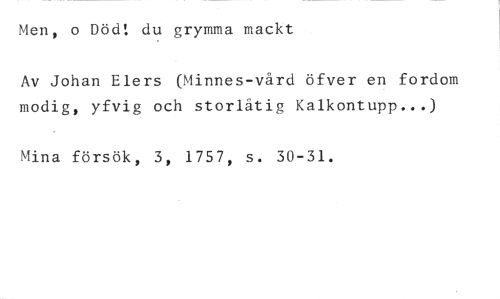Men, o Död! du grymma mackt //// Av Johan Elers (Minnes-vård öfver en fordom modig, yfvig och storlåtig Kalkontupp...) //// Mina försök, 3, 1757, s. 30-31.