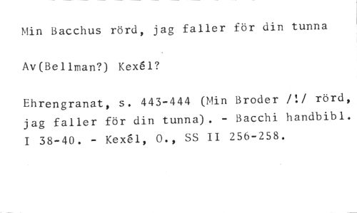 Min Bacchus rörd, jag faller för din tunna //// Av(Bellman?) Kex.1? //// Ehrengranat, s. 443-444 (Min Broder /!/ rörd, jag faller för din tunna). - Bacchi handbibl. I 38-40. - Kexel, 0., SS II 256-258.