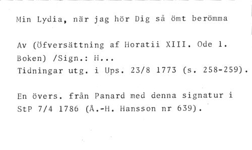 Min Lydia, när jag hör Dig så ömt berömma //// Av Wfversättning af Horatii XIII. Ode 1. Boken) /Sign.: H... //// Tidningar utg. i Ups. 23/8 1773 (s. 258-259). //// En övers. från Panard med denna signatur i StP 7/4 1786 (Å.-H. Hansson nr 639).