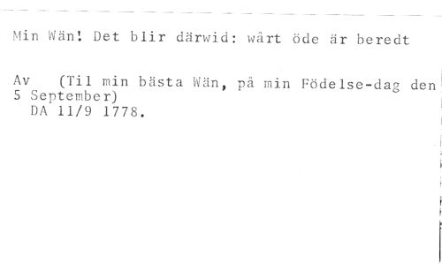 Min Wänt Det blir därwid: wårt öde är beredt //// Av (Til min bästa Wän, på min Födelse-dag den //// 5 September) //// DA 11/9 1778.