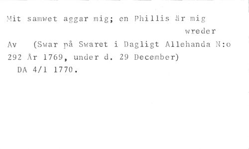 Mit samwet aggar mig; en Phillis är mig //// wreder //// Av (Swar på Swaret i Dagligt Allehanda N:o //// 292 Ar 1769, under d. 29 December) DA 4/1 1770.
