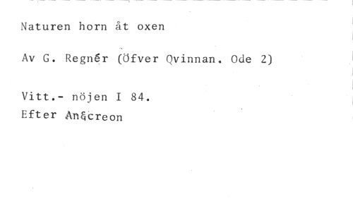 Naturen horn åt oxen //// Av G. Regngr (ifver Qvinnan. Ode 2) //// Vitt.- nöjen I 84. Efter Ancreon