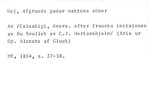 Nej, afgrunds gudar nattens söner //// Av /Calsabigi, övers. efter franska imitaionen av Du Roullet av C.J. Hertzenhjelm/ (Aria ur Op. Alceste af Gluck) //// MT, 1834, s. 37-38.