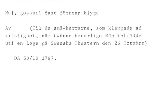 Nej, gossar! fast förutan blygd //// Av (Til de små-herrarne, som klappade af //// kitslighet, när twänne hederlige Män inträdde uti en Loge på Swenska Theatern den 26 October) //// DA 30/10 1787.