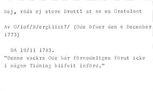 Nej, räds ej store Drott! at se en Gratulant //// Av 0/1of/B/er2klint?/ (Ode öfwer den 6 December 1773) //// DA 19/11 1783. //// "Denne wackra Ode har förmodeligen förut icke i någon Tidning blifwit införd."