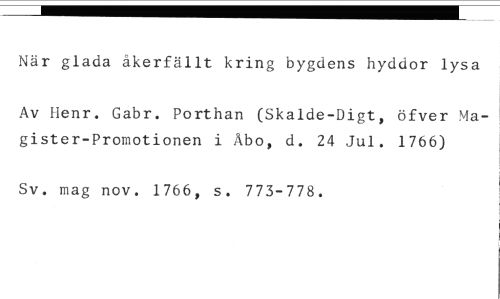 När glada åkerfällt kring bygdens hyddor lysa //// Av Iienr. Gabr. Porthan (Skalde-Digt, öfver Magister-Promotionen i Åbo, d. 24 Jul. 1766) //// Sv. mag nov. 1766, s. 773-778.