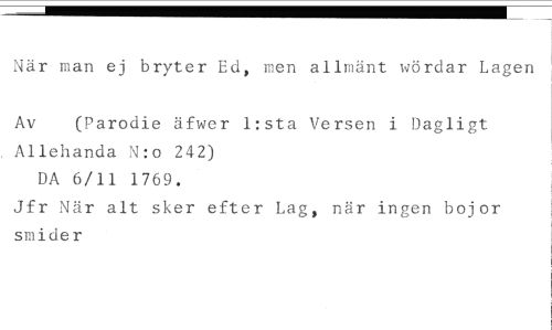När man ej bryter Ed, men allmänt wördar Lagen //// Av (Parodie äfwer l:sta Versen i Dagligt //// Allehanda N:o 242) //// DA 6/11 1769. //// Jfr När alt sker efter Lag, när ingen bojor smider