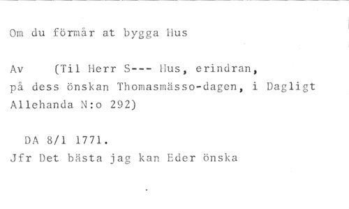 Om du förmår at bygga Hus //// Av (Til Herr S--- Hus, erindran, //// på dess önskan Thomasmässo-dagen, i Dagligt Allehanda N:o 292) //// DA 8/1 1771. //// Jfr Det bästa jag kan Eder önska