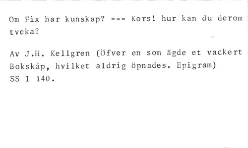 Om Fix har kunskap? --- Kors! hur kan du derom tveka? //// Av J.H. Kellgren (öfver en som ägde et vackert Bokskåp, hvilket aldrig öpnades. Epigram) SS I 140.