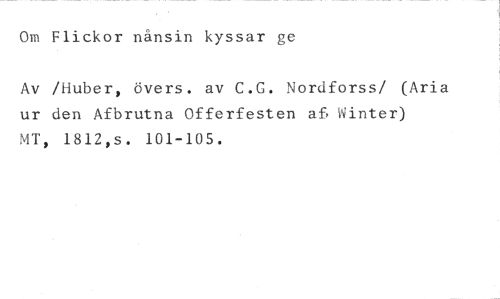 Om Flickor nånsin kyssar ge //// Av /Huber, övers. av C.C. Nordforss/ (Aria ur den Afbrutna Offerfesten af Winter) MT, 1812,s. 101-105.