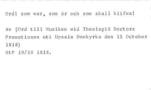 Ord! som war, som är och som skall blifwa! //// Av (Ord till Musiken wid Theologiä Doctors Promotionen uti Unsala Domkyrka den 15 October 1818) //// StP 19/10 1818.