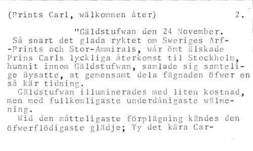 (Prints Carl, wälkommen åter) 2. //// "Gäldstufwan den 24 November. //// Så snart det glada ryktet om Sweriges Arf-Prints och Stor-Ammirals, wår ömt älskade Prins Carls lyckliga återkomst til Stockholm, hunnit innom Gäldstufwan, samlade sig samtelige Bysatte, at gemensamt dela fägnaden öfwer en så kär tidning. //// Gäldstufwan illuminerades med liten kostnad, men med fullkomligaste underdånigaste wälmening. //// Wid den måtteligaste'förplägning kändes den öfwerflödigaste glädje; Ty det kära Car-