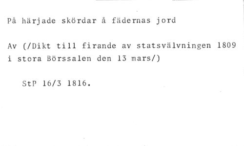 På härjade skördar å fädernas jord //// Av (/Dikt till firande av statsvälvningen 1809 i stora Börssalen den 13 mars!) //// StP 16/3 1816.