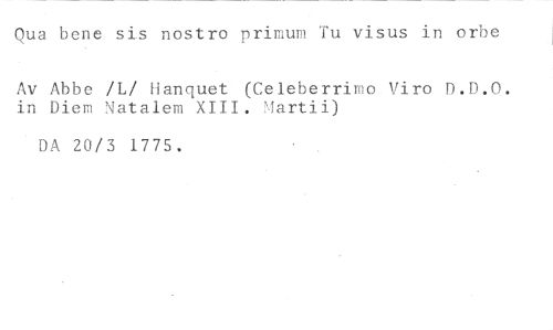 Qua bene sis nostro primum Tu visus in orbe //// Av Abbe /L/ Hanquet (Celeberrimo Viro D.D.O. in Diem Natalem XIII. Martii) //// DA 20/3 1775.