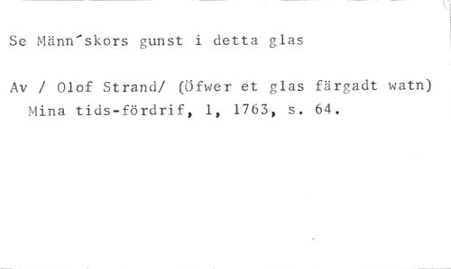 Se Männ'skors gunst i detta glas //// Av / Olof Strand/ (Öfwer et glas färgadt watn) Mina tids-fördrif, 1, 1763, s. 64.