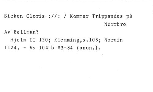 Sicken Cloris ://: / Kommer Trippandes på //// Norrbro //// Av Bellman? //// Hjelm II 120; Klemming,s.103; Nordin 1124. - Vs 104 b 83-84 (anon.).