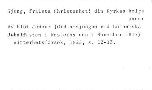 Sjung, frälsta Christenhet! din Kyrkas helga //// under //// Av Elof Jedeur (Ord afsjungne vid Lutherska Jublfästen i Westerås den 1 November 1817) Witterhetsförsök, 1825, s. 12-13.