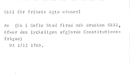 Skål för frihets ägta wänner! //// Av (En i Gefle Stad firad och drucken Skål, öfwer den lyckeligen afgjorde Constitutionsfrågan) //// DA 1/12 1769.