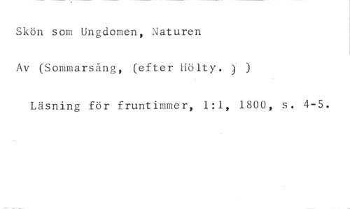 Skön som Ungdomen, Naturen //// Av (Sommarsång, (efter Hölty. ) ) //// Läsning för fruntimmer, 1:1, 1800, s. 4-5.