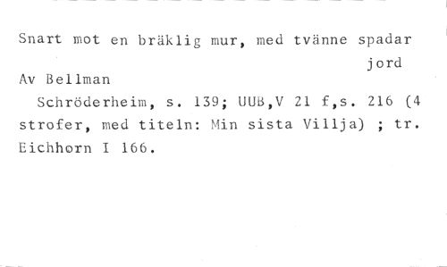 Snart mot en bräklig mur, med tvänne spadar //// jord //// Av Bellman //// Schröderheim, s. 139; UUB,V 21 f,s. 216 (4 strofer, med titeln: Min sista Villja) ; tr. Eichhorn I 166.