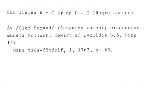Som linjen - C är än - G längre spänder //// Av /Olof Strand/ (Absentes carent; praesentes munera tollunt. Bewist af Evclides B.3. PTop 15) //// vina tids-fördrif, 1, 1763, s. 63.