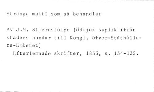 Stränga makt! som så behandlar //// Av J.M. Stjernstolpe (Jdmjuk suplik ifrån stadens hundar till Kongl. Öfver-Stäthållare-Embetet) //// Efterlemnade skrifter, 1833, s. 134-135.