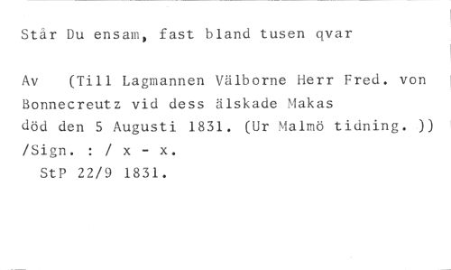 Står Du ensam, fast bland tusen elvar //// Av (Till Lagmannen Välborne Herr Fred. von //// Bonnecreutz vid dess älskade Makas //// död den 5 Augusti 1831. (Ur Malmö tidning.)) /Sign. : / x - x. //// StP 22/9 1831.