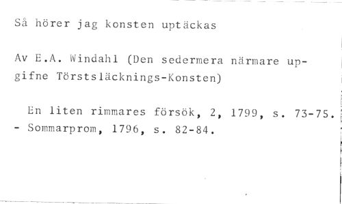 Sä hörer jag konsten uptäckas //// Av E.A. Windahl (Den sedermera närmare upgifne Törstsläcknings-Konsten) //// En liten rimmares försök, 2, 1799, s. 73-75. - Sommarprem, 1796, s. 82-84.