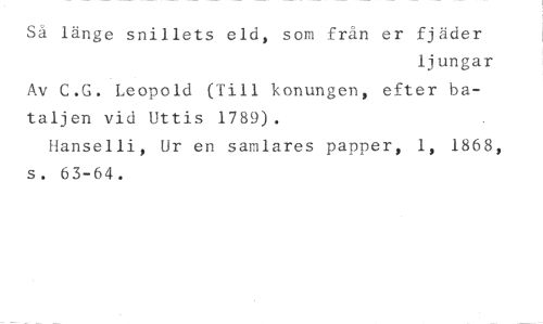 Så länge snillets eld, som från er fjäder //// ljungar //// Av C.G. Leopold (Till konungen, efter bataljen vid Uttis 1789). //// Hanselli, Ur en samlares papper, 1, 1868, s. 63-64.