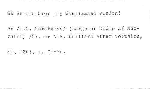 Så är min Bror mig återlämnad vorden: //// Av /C.G. Nordforss/ (Largo ur Oedip af Sacchini) /Or. av N.F. Guillard efter Voltaire, //// MT, 1803, s. 71-76.