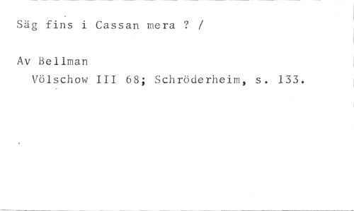 Säg fins i Cassan mera ? //// /Av Bellman //// Völschow III 68; Schröderheim, s. 133.