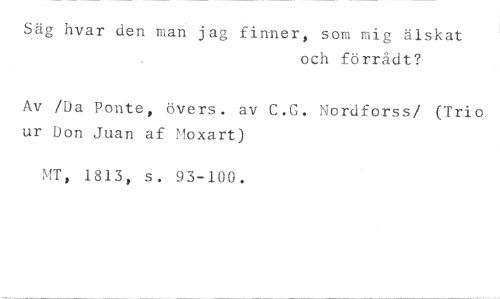 Säg hvar den man jag finner, som mig älskat //// och förrådt? //// Av /Da Ponte, övers. av C.G. Nordforss/ (Trio ur Don Juan af '1oxart) //// MT, 1813, s. 93-100.