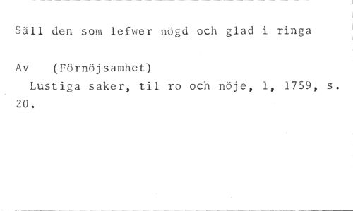 Säll den som lefwer nögd och glad i ringa //// Av (Förnöjsamhet) //// Lustiga saker, til ro och nöje, 1, 1759, s. 20.
