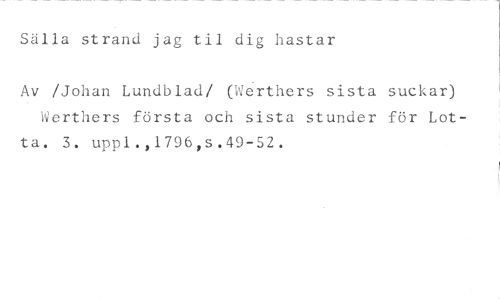 Sälla strand jag til dig hastar //// Av /Johan Lundblad/ (Werthers sista suckar) Werthers första och sista stunder för Lotta. 3. uppl.,1796,s.49-52.