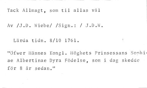 Tack Allmagt, som til allas väl //// Av /J.D. Wiebe/ /Sign.: / J.D.W. //// Lärda tidn. 8/10 1761. //// "Öfwer Hännes Kongl. Höghets Prinsessans Sophiae Albertinae Dyra Födelse, som i dag skedde för 8 år sedan."